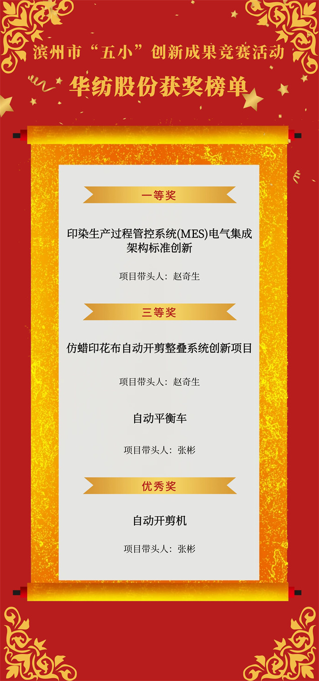 近日,市總工會(huì)開(kāi)展的濱州市“五小”創(chuàng)新成果競(jìng)賽活動(dòng)獲獎(jiǎng)名單公布,公司申報(bào)的4項(xiàng)“五小”競(jìng)賽創(chuàng)新成果喜獲殊榮,其中,《印染生產(chǎn)過(guò)程管控系統(tǒng)(MES)電氣集成架構(gòu)標(biāo)準(zhǔn)創(chuàng)新》獲一等獎(jiǎng),《仿蠟印花布自動(dòng)開(kāi)剪整疊系統(tǒng)創(chuàng)新項(xiàng)目》《自動(dòng)平衡車》獲三等獎(jiǎng),《自動(dòng)開(kāi)剪機(jī)》獲優(yōu)秀獎(jiǎng)。
